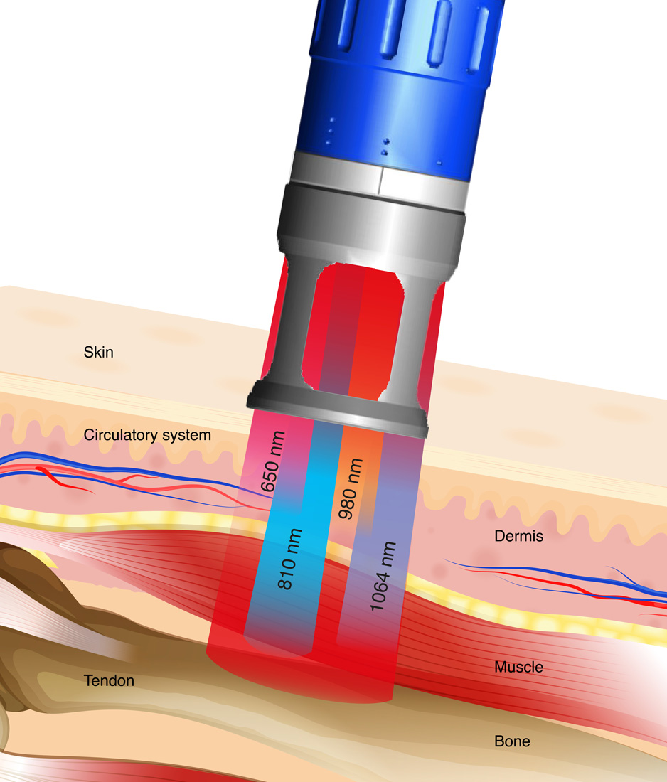 - až čtyři vlnové délky v terapeutickém okně 600–1400 nm